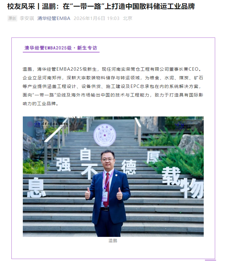 С расширением масштабов компании и углублением ее глобализации Вэнь Пэн осознал, что необходимо идти в ногу со временем и, прибегая к систематическому обучению, противостоять будущим вызовам. С этой целью он выбрал углубленное обучение по программе EMBA Школы экономики и менеджмента Университета Цинхуа, чтобы перестроить свое стратегическое видение и управленческую структуру. Этот учебный процесс стал не только системным усилением его личных способностей, но и накоплением ключевого импульса для будущего развития компании. Сегодня, обладая более четкой стратегической картой и более надежной управленческой методологией, он продолжает продвигать SRON, демонстрируя в глобальной сфере хранения и транспортировки сыпучих материалов твердую силу и ответственность китайской промышленности в эпоху благодаря мастерскому исполнению, надежному качеству, а также экологичным и интеллектуальным технологиям.